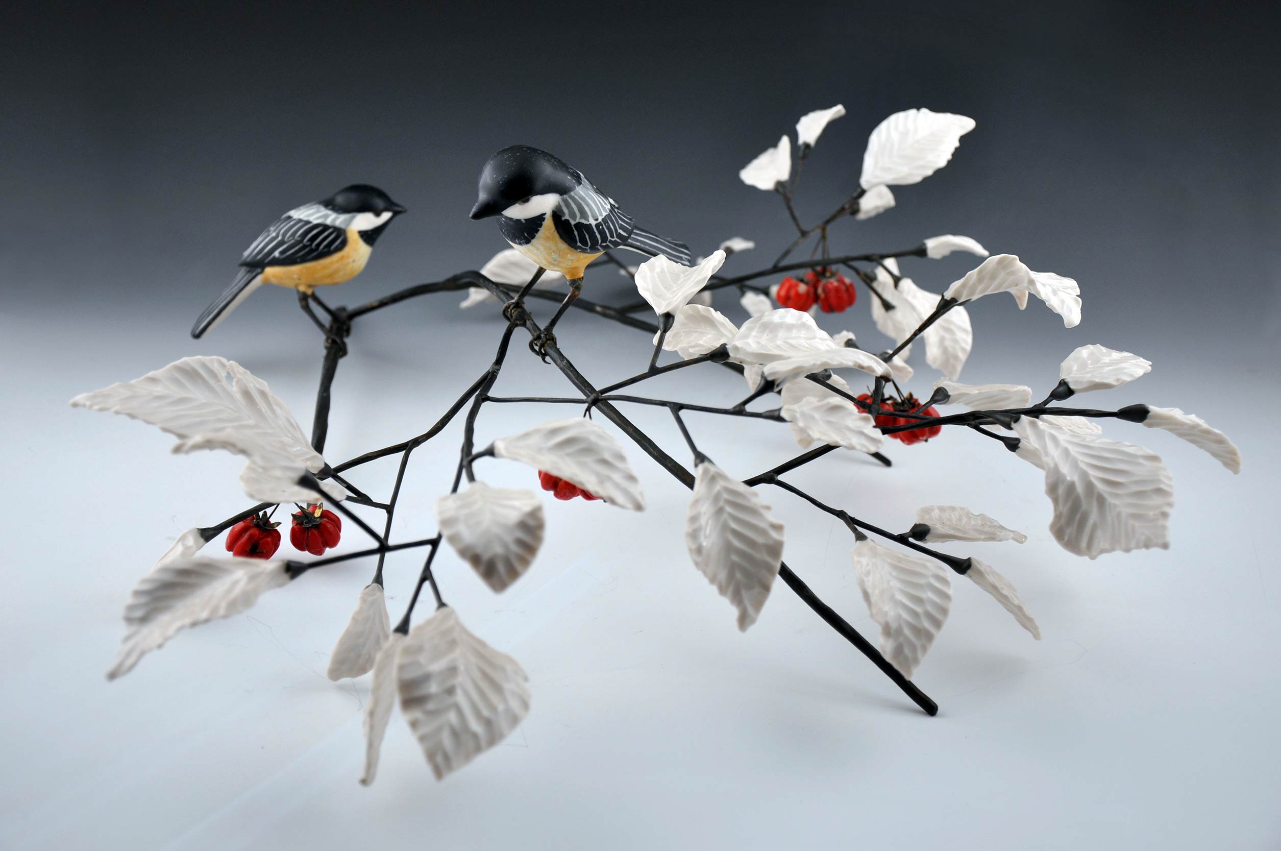Katherine has started a new series of sculpture projects. These works aim to reflect the vitality and gestures of the natural world, while also embracing the bold, hand worked character of each of the materials used. These works combine hand forged iron, porcelain leaves, flowers and birds, cast bronze and forged copper.